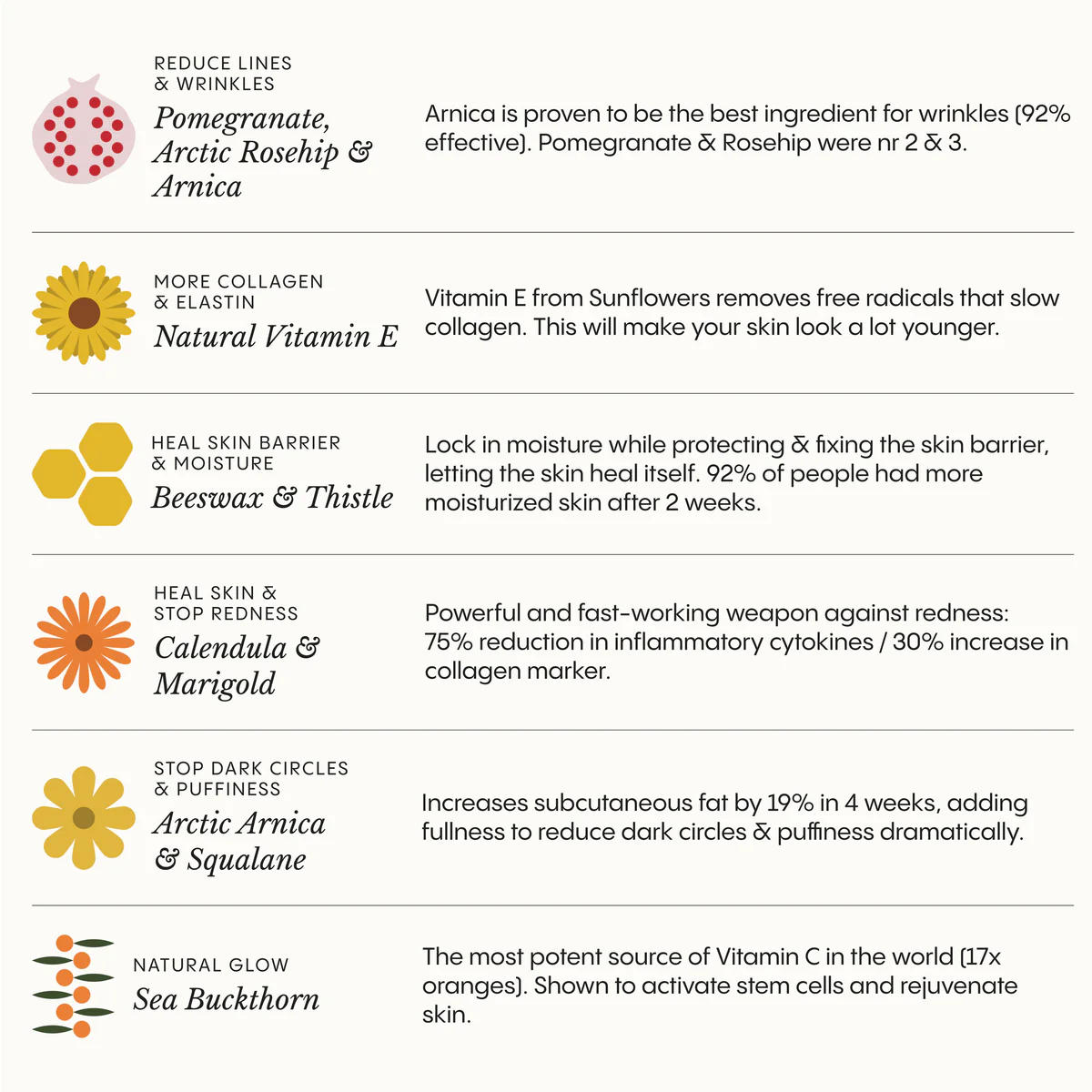 380ââingredients were tested on humans for anti-ageing and our main ingredient Arnica was proven most effective (Study). We source it wild on the Norwegian mountainside to capture the maximal antioxidant potential